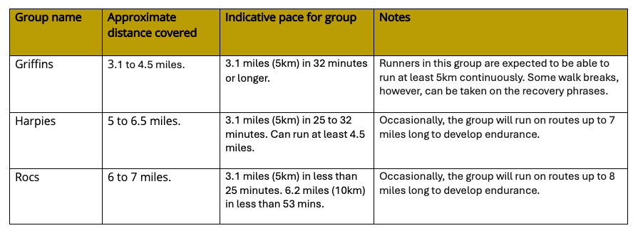 Fartlek (group) runs. After an appropriate warm up we use a series of timed intervals (efforts) where we run harder/faster before running slowly (recovery period). During the recovery period we all re-group before starting the next effort….and so on. These sessions cover distances of between 4.5 and 7 miles depending upon the ability of the runners involved. These sessions usually start and finish at our principal meeting point in the car park at St Nicholas Park, Pilgrims Way. Our speed endurance sessions are run in ability/pace based groups. The groups are named after mythical birds - Griffins, Harpies and Rocs. Each are led by at least one of our run leaders and are in safe group sizes so runners and other members of the public are not put at risk.